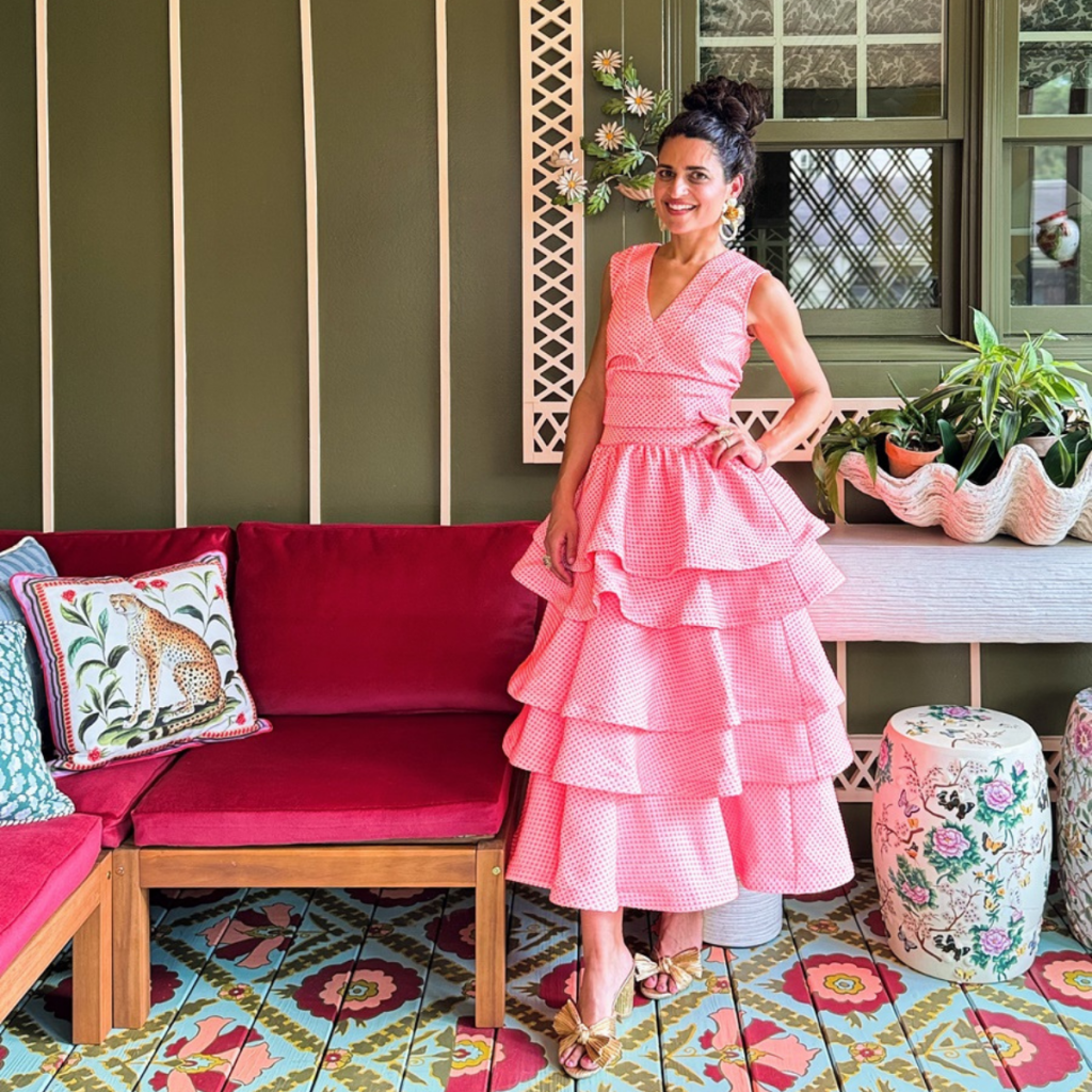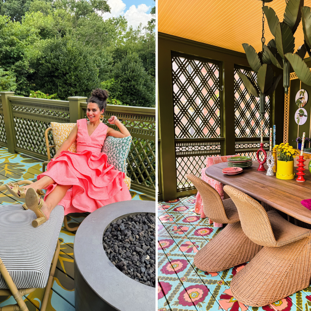 For her screened-in porch and patio, Isabel selected textiles that added vibrancy, depth and delight. Drawing inspiration from the hand-painted floor, she curated a selection of Perennials fabrics for the colorful upholstery and pillows.